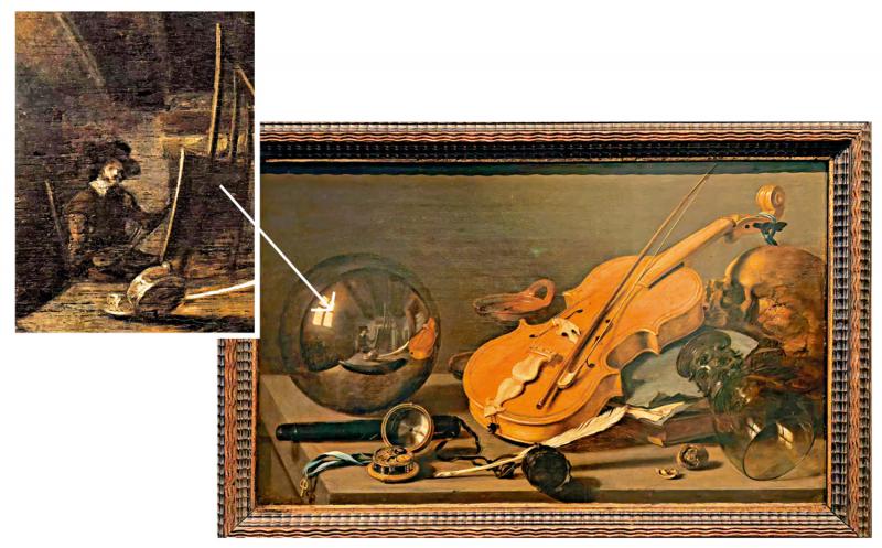 照片:彼得.克莱斯的画作《小提琴和玻璃球的虚空绘画》以及画作左侧隐藏在玻璃球中的艺术家自画像。 \ 图片由作者提供:第一次访问德国纽伦堡时,专程参观了阿尔布雷希特·丢勒故居博物馆。然而城内的日耳曼国家博物馆却给了我更多的惊喜。没想到,在文艺复兴的辉煌褪去之后,纽伦堡这座城市还能拥有如此庞大、现代化的博物馆,并且收藏了非常丰富的以德国为首的北方文艺复兴时期的艺术品。在侧厅展厅一角的荷兰黄金时代展区,有一幅彼得的画作。尽管相邻的墙上挂着两幅伦勃朗的作品,但彼得·克拉斯(Pieter Claesz)的人生画作《小提琴和玻璃球的虚空绘画》吸引了我的全部注意力。这幅带有各种物体的小型静物画于 1628 年完成,当时艺术家 30 岁。这幅画深棕黑色的背景让人想起伦勃朗的肖像画。然而,比伦勃朗年长近十岁的彼得,克拉斯显然比前者更早达到绘画技巧的顶峰。这是一幅桌子上堆满各种物体的静物画,充分展现了艺术家完美描绘各种物体材质的能力。画中最引人注目的自然是一把斜靠在书本上、占据画中央的小提琴。以它为中心,从左到右,房间的窗户上摆着一个玻璃球,倒影在房间的窗户上,前景是一个撞针打开的时钟,一个倒立的墨水瓶,上面靠着一支羽毛笔,时钟后面的一个皮箱组成了一个“书写组”,一根没有油灯的蜡烛,破裂的核桃,一个翻转的空玻璃,以及最右边小提琴下的一个头骨……画面中的一切都指向一个表明暴徒的思想。可想象的心灵指向一个思想——可想象的心灵指向可想象的心灵 可想象的心灵指向可想象的心灵 隐喻——世俗快乐的短暂和生命的衰败。十九世纪,以上述物品为主题的“虚荣绘画”(源自拉丁文Vanitas,原意为“虚荣”)在荷兰流行。最初,绘画背景上经常只画骷髅,象征着死亡和生命的短暂。十九世纪初,宣扬“预定论”、强调现实生活道德约束的加尔文主义在荷兰流行。 “虚空画”,拒绝世俗享乐的重要性,高喊对人类贪婪的宗教批判,达到了顶峰。这类以具象的事物来暗示道德警示的绘画通常包括三种类型的符号:珠宝、音乐工具以及通过财富获得的其他乐趣;头骨、沙漏、钟表、花朵、肥皂泡等物体专指生命的短暂;而书籍和科学仪器则通过对知识和信仰的思考蕴含着精神上的救赎。数一数,彼得。克莱斯的《小提琴和玻璃球的虚空绘画》几乎包含了这一静物流派的所有可识别物体。那么,吸引我在画前久久驻足的,仅仅是以“虚”为主题的事物的完整性吗?显然不是。这件作品真正让我印象深刻的细节是画面左侧玻璃球中隐藏的艺术家的自画像。如果追根溯源,在凸面镜上画自画像的传统也来自荷兰。杨被称为“西方油画之父”。扬·凡·艾克 (Jan Van Eyck) 在他著名的《肖像》中,在隐藏在背景墙中的凸镜上的自画像《阿尔诺菲尼夫妇》首创了这种令人眼花缭乱的技法。这种形式不明显也不显露,悄然取代了个人签名,成为日后许多艺术家竞相模仿的技法。后来英年早逝的艺术大师帕玛强尼诺(Parmigianino)留下了最具代表性的《凸面镜上的自画像》,才让这种形式的自画像开始独立存在。而彼得·克莱斯创作的这幅虚空静物画一个世纪后的“荷兰黄金时代”无疑继承了他的荷兰崇拜者范的作品,他实现了彩色玻璃自画像和静物主题的巧妙结合。事实上,即使在画中的许多金属或玻璃表面上都有折射数据,最引人注目的亮点还是玻璃球体中反射的内部窗户,克莱斯不仅通过精确地描绘每个物体的材质来展示他非凡的绘画技巧。通过反映在彩色玻璃上的“自画像”,仔细地传授了这项技能。画中,彼得通过玻璃球的反射“出现”。戴着高礼帽的克拉斯坐在画架前,专心描画桌上的物品。皮套、钟表、羽毛笔和大提琴都是各种细长变化的彩绘玻璃球。艺术家的脸部清晰可见,因此无需在画布上签名。作品本身成为能够“证明”他的最真实的传记文献。 “画中的艺术家”可以理解为“超出所见”的更深层次的含义。玻璃球的脆弱性和反光性,就像虚空画中经常出现的肥皂泡一样,象征着人类生命的脆弱和黑暗。克雷斯选择将自己画在玻璃球里,无疑是试图通过这种令人眼花缭乱的技术细节来超越凡人的死亡,为他的艺术成就留下了不朽的记录。这个世界。