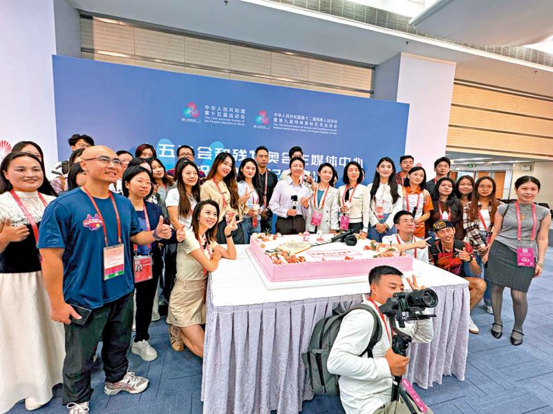 图:全运会主媒体中心准备了长1.1米、宽0.8米的“记者节蛋糕”。 \ 大公报记者 卢静宜 摄 11月8日是第26个中国记者节。工作在全运会报道第一线的媒体人在忙碌之余也开始放假了。在广州主媒体中心,来自内地和港澳的媒体同仁齐聚一堂,为开幕式报道做准备,同时分享温馨的节日瞬间。现场环境热闹,在专门设计的智能体验区,与机器人互动、体验VR设备等项目增添了许多乐趣。主办方精心准备了长1.1米、宽0.8米的“记者蛋糕”,搭配麦克风、相机、笔记本组成的“妈妈美丽三件套”,造型栩栩如生,细节十足。除了广州主要媒体中心外,D奥冠还在两场全运篮球比赛场馆的媒体中心专门为前来采访比赛的记者准备了节日蛋糕和烤鹅,显得格外暖心。从北京来到广东采访全运会的新华社记者高尚笑着说,11月8日是他的生日。 “我妈还说我很会择日。”他说,虽然编辑到天亮有点累,但看到这么多同事在广东庆祝,他还是感到很温暖、很幸运。这里的体育氛围很浓,食物也很好吃,我很开心。”