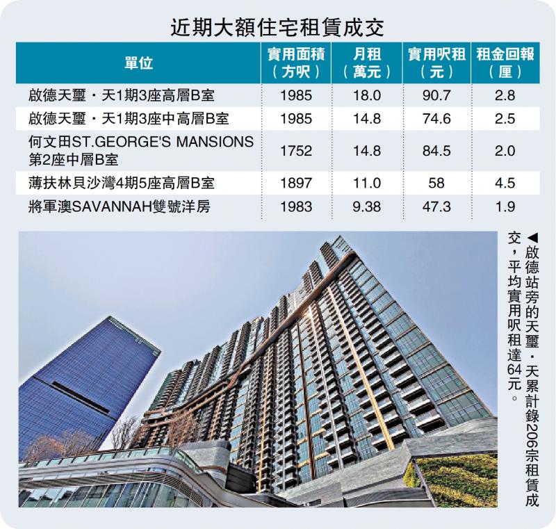相片:启德站旁的天印。每日共录得206笔租赁成交,平均每平方尺租金达新台币64元。特区政府积极招揽人才,专业人士来港政策强化了香港租赁市场。每月每日租金两次超过上限。项目内四房单位每月租金仅新台币18万元,每平方尺实际租金超过新台币90元。无论是月租还是每平方尺租金都是东九龙分层住宅楼中最贵的。与上个月以下单位创下的旧纪录相比,大幅上涨了22%。 \ 大公报记者 林慧芳 由于职场人士普遍偏爱寻找优质住宅,豪宅租赁市场一直活跃。机构人士指出,天喜。天一期3座高层B室,实用面积1,985平方尺。它是作为四间卧室和两间套房。以月租新台币18万元出租,为住宅房屋中最高价,相当于每平方尺实际租金为新台币90.7元。这创下了启德新区租金和平方英尺租金的最高纪录,并创下了东九龙分层住宅的租金新纪录。资料显示,业主于2024年12月以新台币7755万元向开发商买下上述用地,此前曾以新台币9100万元出售,并以新台币20万元出租。现以新台币2万元小幅优惠出租,租金回报率约2.8%。天玺四居室租金为18万元,环比上涨21.6%。位于启德站旁边。田先生自今年7月入伙以来,一直受到租户的追捧。随着出租单位被市场消耗,租金上涨。其中,一期中高层建筑B室,实用面积为面积 1,985 平方英尺。上个月以月租14.8万元出租。当时,它创下了国有住房的新高,可用平方英尺租金为74.6元。该单位此时出租,价格突破新台币18万元。即使楼层高了9层,租金仍然高出32,000美元。这意味着房屋物业租金记录在一个月内增长了21.6%。这意味着启德新楼大单位很受欢迎。据经纪人天喜介绍。天一一期至今共录得206宗租赁成交,平均实用租金为每平方尺64元。其中,月租金10万元以上的交易暂录2笔。天锡。该物业提供罕见的大型单位。共有112个4房单位,起居面积从887平方英尺到3,936平方英尺不等。较大的单位深受高端租户的欢迎。全国最贵租金记录启德新区于今年五月设立。这是天环天海汇2号塔的4房复式单元A,迎宾面积2,399平方英尺,带天台。租金新台币155,000元。当时在东九龙一栋分层住宅楼创下新高租金yetra,实用租金每平方尺新台币64.6元。最新纪录增长了16.1%。将军澳房屋租金每平方尺新台币47.3元。另一方面,将军澳亦录得大量租金成交。区内代理指出,将军澳屋苑沙湾录得首宗平房租金。涉及一间双层洋房,实用面积1,983平方尺,连花园及天台。这是一间四卧室双人套房,设有储藏室隔断。月租为新台币93,800元,实用平方租金为新台币47.3元。租金创下了该房屋历史上的最高纪录。原来的业主为大陆背景,2019年以新台币5883.5万元买下上述地址,租金回报率为1.9%。将军澳最后一宗月租新台币10万元的住宅出租案例,可以追溯到2023年,为蒙特利双层洋房,实用面积2,048平方尺,附花园。而俯瞰湾景的天台,当年的租金为新台币10万元,可用平方尺租金为新台币48.8元。