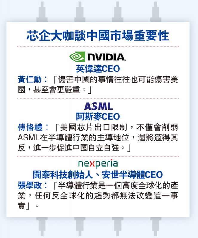 图片:芯片公司大咖谈论中国市场的重要性。 NVIDIA 首席执行官黄仁勋:“伤害中国的事情也可能伤害美国,或者更严重。” ASML首席执行官傅克利:“美国出口限制”闻泰科技创始人、安世半导体首席执行官张学政:“半导体行业是一个非常全球化的行业,任何逆全球化趋势都不会改变这一事实。”