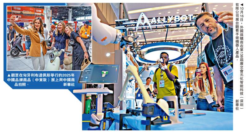 左:匈牙利布达佩斯2025中国品牌商品(中东欧)观众与中国产品合影。右图:10月16日,第138届广交会,国外采购商在远华智能科技(深圳)有限公司展位参观手术机器人产品。国家统计局20日公布的新华社数据显示,前三季度国内生产总值1015.036亿元(人民币,下同),同比增长5.2%。经济运行将继续保持总体平稳、稳中向好的发展态势。其中,高新技术领域、消费增长和进出口数据良好。人工智能、脑机接口等前沿技术提前布局。规模以上数码产品制造业增加值同比增长9.7%,新动能有所回落。一个辐条国家统计局sman分析前三季度数据有“三个变化”:我国经济平稳运行的基调没有改变;扎实推进质量发展的趋势没有改变;经济稳定性强、潜力大的主要特征没有改变。 “十四五”期间,中国经济对世界经济增长的年均贡献率保持在30%左右,显示了主体国家经济的稳定性和活力。国家统计局新闻发言人指出,放眼全球,中国始终是世界经济增长最稳定、最可靠的动力源。 \ 大公报记者 国家统计局新闻发言人朱野指出,从经济增速看,前三季度国内生产总值(GDP)增长5.2%,同比加快0.2和0.4个百分点分别快于全年和去年同期;经济增长39.679亿元,同比增加1368亿元。从国际收支看,对外贸易表现出较强的稳定性,货物进出口规模创历史同期新高,增速逐季加快。主要实物量指标也保持稳定增长。前三季度,规模以上工业发电量同比增长1.6%,货运周转量、旅客周转量分别增长4.8%和4.4%。发言人指出,今年以来,外部环境变化不利影响加深,国内有效需求不足,部分企业经营困难。发言人指出,促进经济平稳运行面临诸多挑战困难和挑战。在此情况下,中国经济实现了5.2%的增长,经济保持稳中向好态势,充分展现了中国经济抵御干扰的能力和在不稳定不确定环境下抵御压力的强大稳定性。谈到“十四五”期间取得的重大成就,发言者指出,“十四五”期间,中国经济在复杂环境中应对困难、稳中有进,取得了总量增长、增量大增、质量提升的显著成就。年均实际GDP增长率为5.5%,高于同期世界年均增长率3.9%。人均GDP将从2020年的10,632美元增至2024年的13,445美元,稳居收入最高国家之列。此外,研发投入屡创新高到2024年,研发投入强度达到2.69%,超过欧盟国家平均水平。到2025年,中国创新指数排名将首次跻身全球前十,较2020年上升4位,跻身收入经济体前列。首位。专家:在全球形势复杂多变的背景下,丰富政策工具、谋求发展,中国不断出台多项政策。商务部研究院研究员周蜜表示,这些政策主要集中在三个维度。一是注重经济增长稳定;二是深化驱动变革;三是推动国际协调不断深化。周密强调,主要政策不是要固定“蛋糕分配”模式,而是要通过加强贸易伙伴与市场主体的合作,为市场主体创造有效、可靠的发展环境。确保产业链供应链稳定发展,从根本上实现“蛋糕做大”。 “中国有政策工具,在此基础上,中国不断加大创新资源投入,同时积极鼓励各类创新合作,以开放姿态为世界经济增长注入新动能、创造新增量。”周密表示,从全球来看,中国通过提出全球治理倡议、积极推动双多边贸易谈判,有效加强了与全球贸易伙伴的协调配合。 “这些政策为中国经济稳定发展增添了信心。”