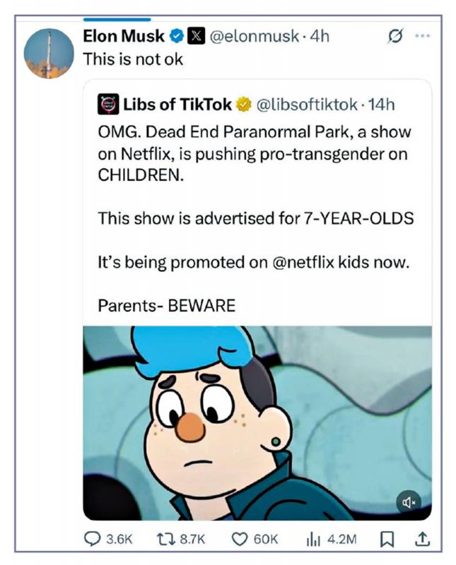 照片:马斯克在1 -1上发布了一条消息,以抵制Netflix动画“死胡同:超自然公园”。 \ Network Pictures [Ta Kung Pao News]全面的天空新闻和每日邮件报告:Netflix儿童动画片的美国流媒体平台的内容引起了争议。公共大亨马斯克大亨马斯克在SA -1上的社交平台上呼吁从Netflix上宣布,称其为“儿童健康”,并设置了一波未订阅的浪潮。 Netflix的股价最近崩溃了,退订的波浪将导致市场价值损失151亿美元。引起争议的原因是Netflix的2022漫画《死胡同:超自然公园》,该卡通于2023年结束,讲述了一个男孩在一个闹鬼的主题公园工作的故事。早些时候,卡通导演斯蒂尔(Steele)在社交媒体上引起了争议,在社交媒体上是一个保守的互联网名人柯克(Kirk),称柯克(Kirk)为“纳粹”(Nazi)。一些“死胡同:超自然公园”的剪辑再次蔓延,风暴继续进行扩张。马斯克说,该动画已经促进了7岁儿童的“变性意识形态”,并于9月30日表示,他完成了对Netflix的认可。共和党众议员格林和其他政客还指责Netflix在儿童计划中促进跨性别者。马斯克还退休了一位用户的帖子,他说,Netflix“雇用了某人来庆祝柯克的杀戮,并制作了以跨性别的支持出售我的孩子的内容。”马斯克对帖子的回应说:“如此。”保守派批评Netflix坚持对儿童的误解,网民在平台SA社会上推出了“ #CancelNetflix”标签,批评Netflix促进了“觉醒意识形态”,更多的网民在挖掘涉及性别性别认知感的Netflix的其他“问题漫画”。受未订阅的浪潮影响,Netflix的股价连续两天下降了6%,而2 -2-凌晨的最新摘录为1,137美元。