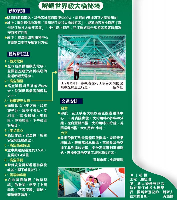 上图:9月28日,客人在Huajiang Canyon桥的镜子里走进镜子。 \新华社;下图:新婚夫妇的“超级项目超级浪漫”婚礼注册活动在Huajiang Canyon Bridge举行。图片显示了一对新注册的夫妇在桥上拍照。 \ Huang Feng的照片约会指示●除云杜服务区外,其他地区还悬挂5,000人,他们需要提早通过官方频道进行约会,●在线:在线:跟随Wechat官方“ Wechat” Guizhou Huajiang huajiang Canyon Bridge Tourist of the Guizhau hiip nip nip trongrip of guizhau hiip trip: Huajiang Bridge Tourism综合旅游区旅游服务终端票票●离线:旅游Window Windowalea旅游服务中心支持许多付款方式,新的方式播放前往桥梁1。观光电梯●最高BRidge Bridge Bridge桥,这是电梯到建在高塔桥上的国家的第一个透明转移。 2。高海拔蹦极跳跃●高空蹦极跳项目的倒台约为625米,排名世界上最高的跳跃点之一。 3.玻璃观光厅●该区域为1,314平方米,它具有旅游平台,浪漫的登机点,文化和创意区,Gaoqiao邮局,旅行摄影区,博物馆展览区,地区区域和其他项目。 4。令人惊讶的心脏●悬挂小径 +安全绳,与绳索安全绑在一起以征服高度。 5。高海拔赛车轨道●风赛车轨道约为1.5米,总长度约为1.4公里6。高度绳索●绑住安全绳,在钢丝上跑步时踩下大炮,而Huajiang在您的脚下。 7。云咖啡馆●看着咖啡馆中“地面假期”的伟大,震惊的震惊上面的云层,看着下面的深处。登上飞机,前往Longdongbao机场,Anshun Huangguoshu机场,Xingyi Wanfenglin机场,然后转移到其他运输方式到旅游区;